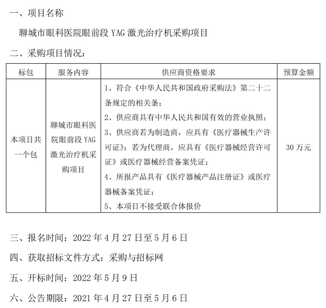 聊城市眼科醫(yī)院眼前段YAG激光治療機(jī)采購項目招標(biāo)公告