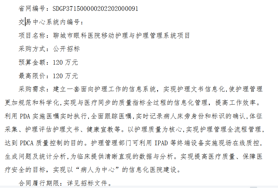 聊城市眼科醫(yī)院移動護理與護理管理系統(tǒng)項目 招標公告