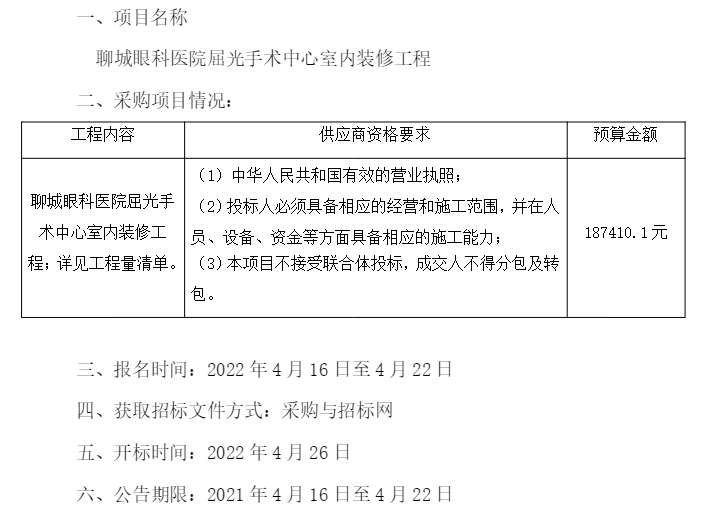 聊城眼科醫(yī)院屈光手術(shù)中心室內(nèi)裝修工程招標(biāo)公告