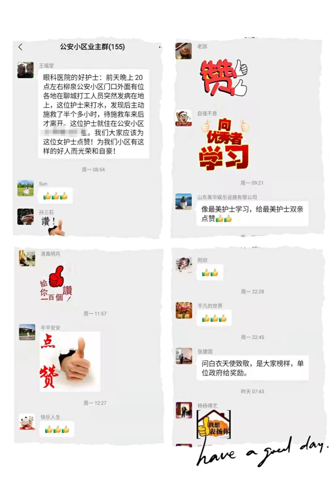 公安小區(qū)的物業(yè)工作者通過監(jiān)控“搜尋”,才知道她是32號樓的住戶。當(dāng)被追問其姓名、工作單位等情況時,她卻連忙擺手說道:“自己只是做了一個醫(yī)護(hù)人員該做的事,不值得一提。”事后公安小區(qū)物業(yè)工作人員通過多方了解,才知道她是聊城市眼科醫(yī)院神經(jīng)眼科護(hù)士王杰。王杰護(hù)士跪地救人的事情,在柳泉小區(qū)微信群里引來許多點(diǎn)贊聲。
